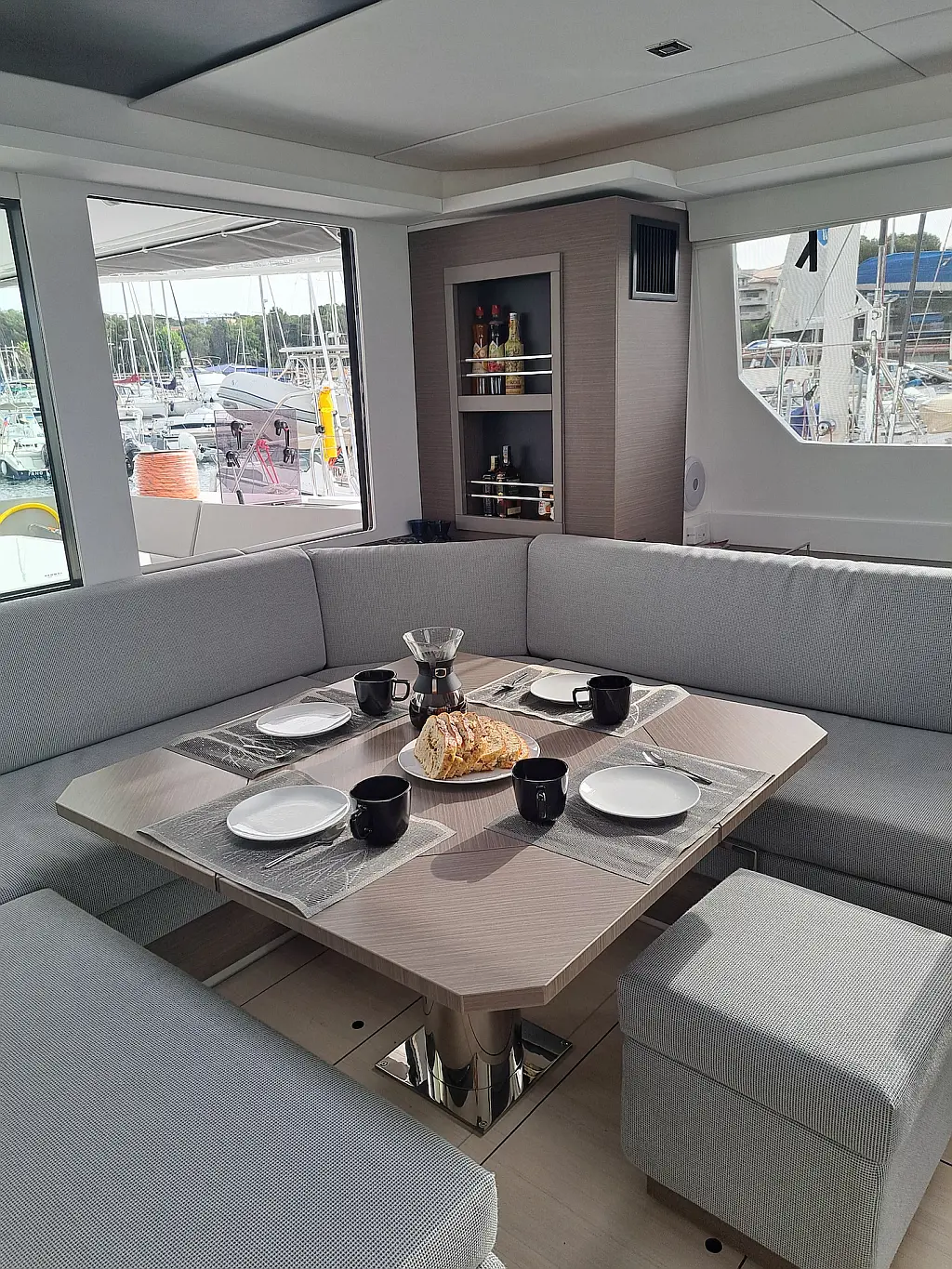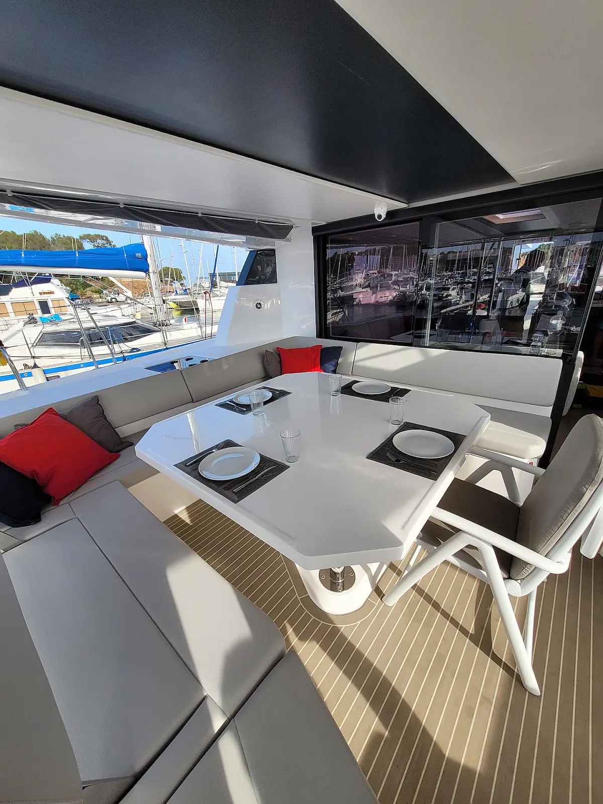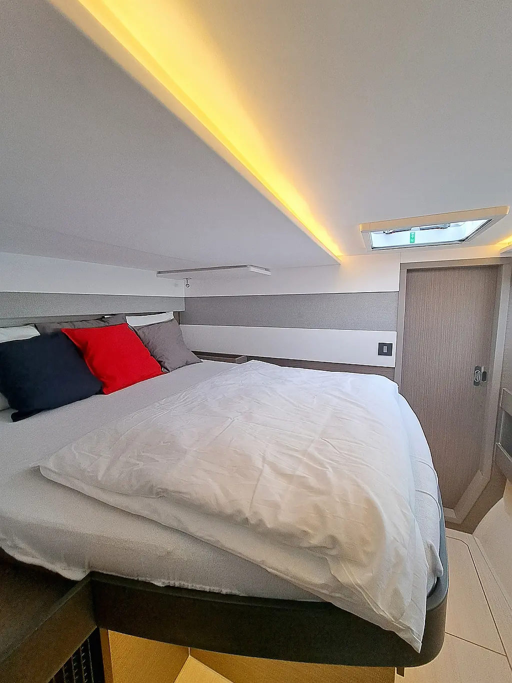 Odslovací zařízení (220V 117L/h), Generátor 220V (9KW), Měnič napětí 12V/220V (3kW), Pračka/sušička, Solární panely (4x400W), Rozvod teplé vody, Elektrická WC (5), Klimatizace ve všech kajutách a salonu