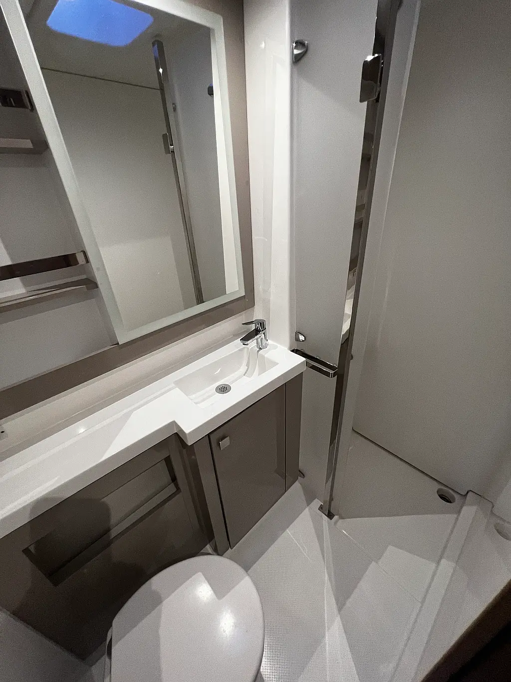 Odslovací zařízení (220V 180L/h), Generátor 220V (11kW), Měnič napětí 12V/220V (2kW), Solární panely (3x175W), Rozvod teplé vody, Elektrická WC (5), Klimatizace ve všech kajutách a salonu
